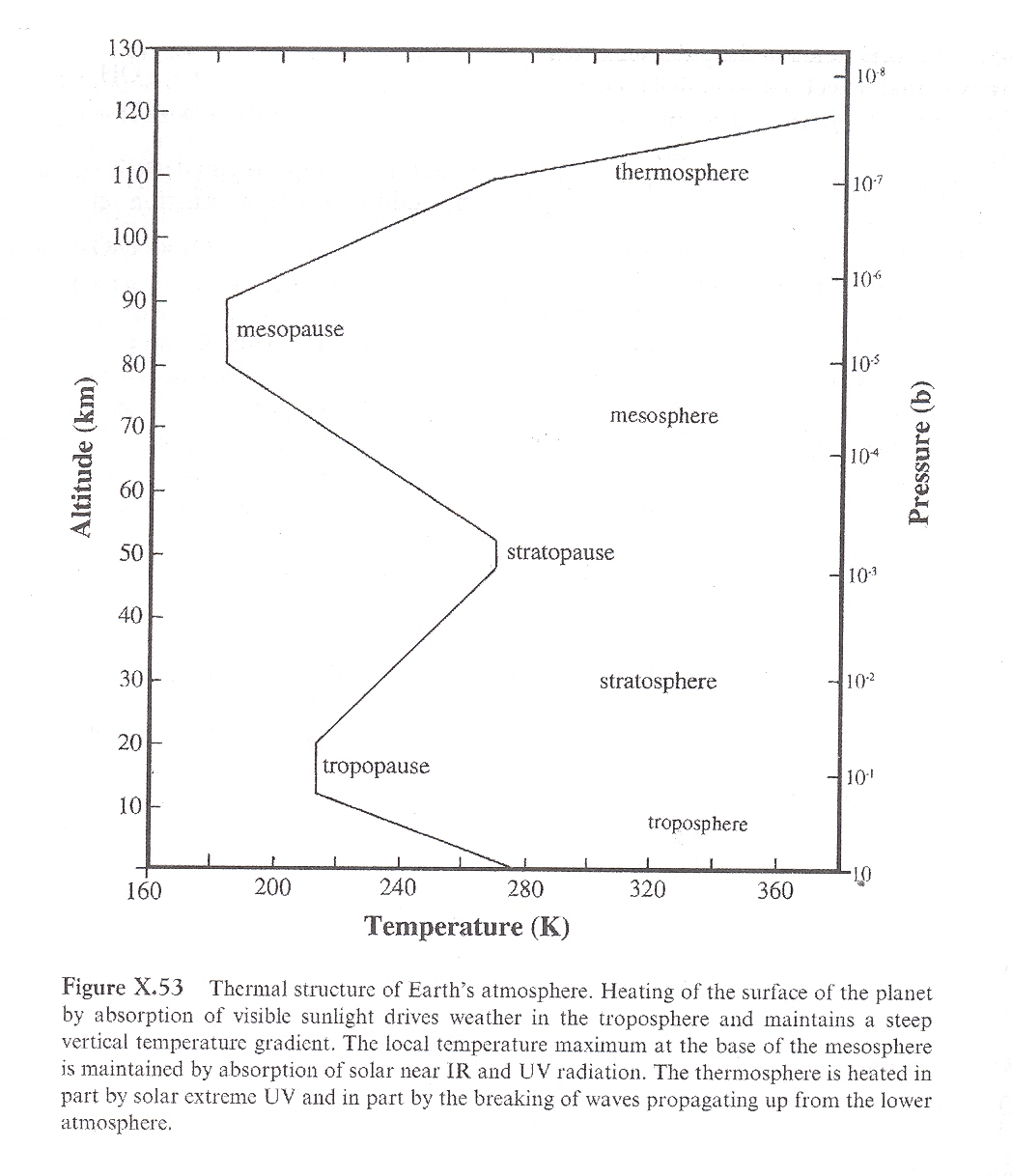 Near the surface of the Earth (troposphere) temperature decreases with height, as you probably have experienced if you have ever hiked or driven up a mountain. To understand this, we must realize that the atmosphere is heated by radiation both from above (sunlight) AND FROM BELOW (thermal radiation from Earth). The surface of the Earth, at a temperature of 250 to 300 K, radiates in the 10 to 12 micron region *UP* from the surface. As the radiation heats the air near the ground, it is "used up", so there is less as one goes up, and so the air temperature decreases with increasing height where this heating mechanism dominates (troposphere).
